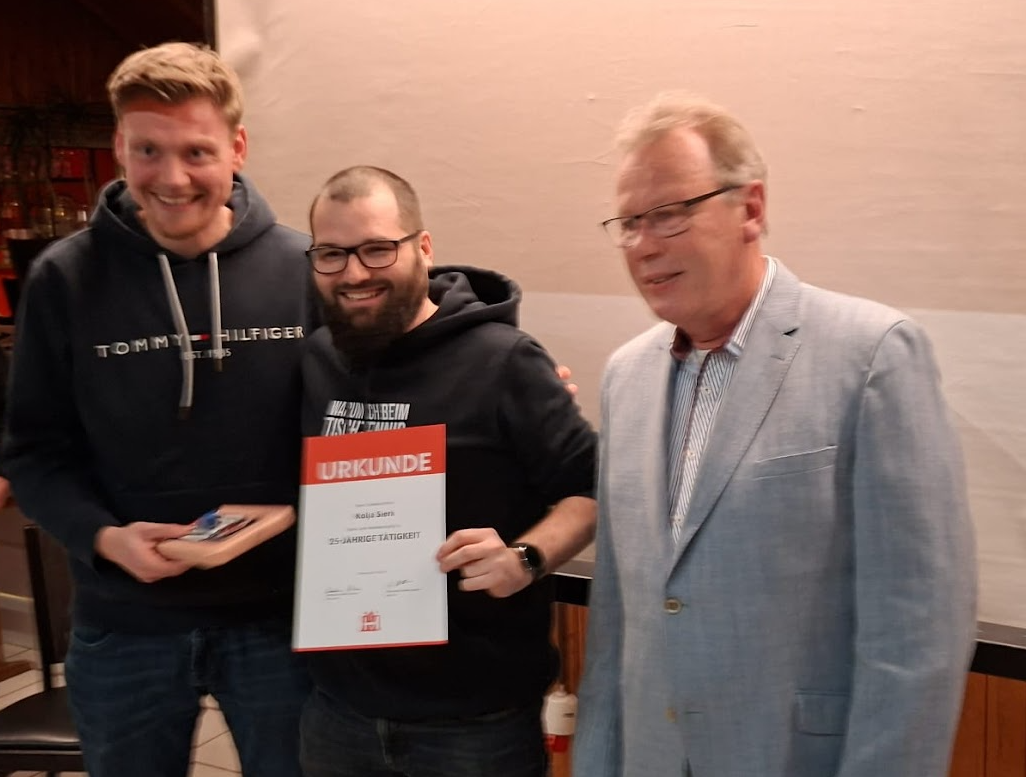 Für 25 Jahre Schiedsrichter-Tätigkeit werden David Fock (VfL Pinneberg), Sören Krohn (TuS Borstel) und Kolja Sierk (Heidgrabener SV) ausgezeichnet. Ein Vierteljahrhundert Spielleitungen bedeutet unzählige Einsätze bei Wind und Wetter, große Verantwortung sowie die Bereitschaft, dem Fußball dauerhaft etwas zurückzugeben.